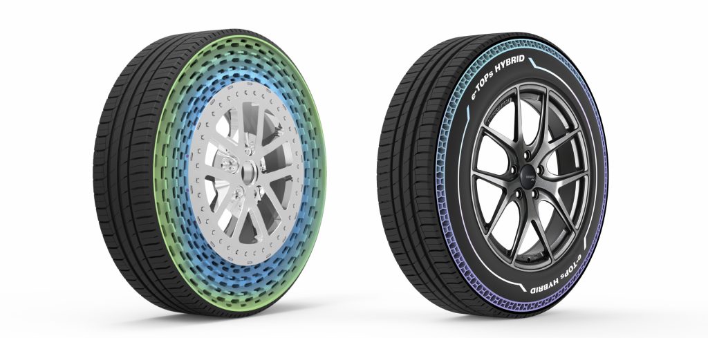 e-TOPS meanwhile is a hybrid product that is claimed to encompass the combined strengths of pneumatic and airless tires. An airless upper structure of spokes and tread protects the tire from foreign matter, while a lower, less vulnerable section contains a volume of air. According to the company, this complementary composition results in an equivalent performance to conventional tires while avoiding issues with air loss.