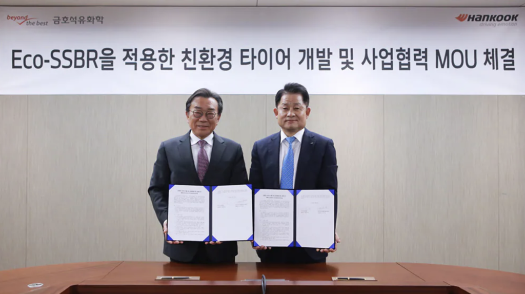 A memorandum of understanding (MoU) signed between Hankook Tire and Kumho Petrochemical will see the duo working on the development of eco-friendly tires using eco solution-polymerized styrene-butadiene rubber (eco-SSBR).