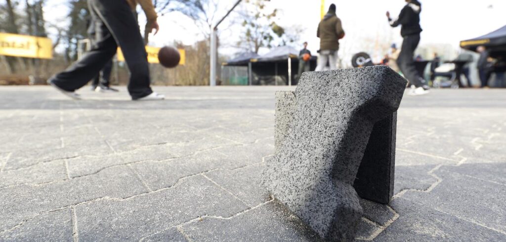 Regupol, an elastomer processing company, transformed the end-of-life tires into rubber paving blocks, which Kretschmer, a Hannover-based sports-field construction company, used to assemble the sustainable playing surface.